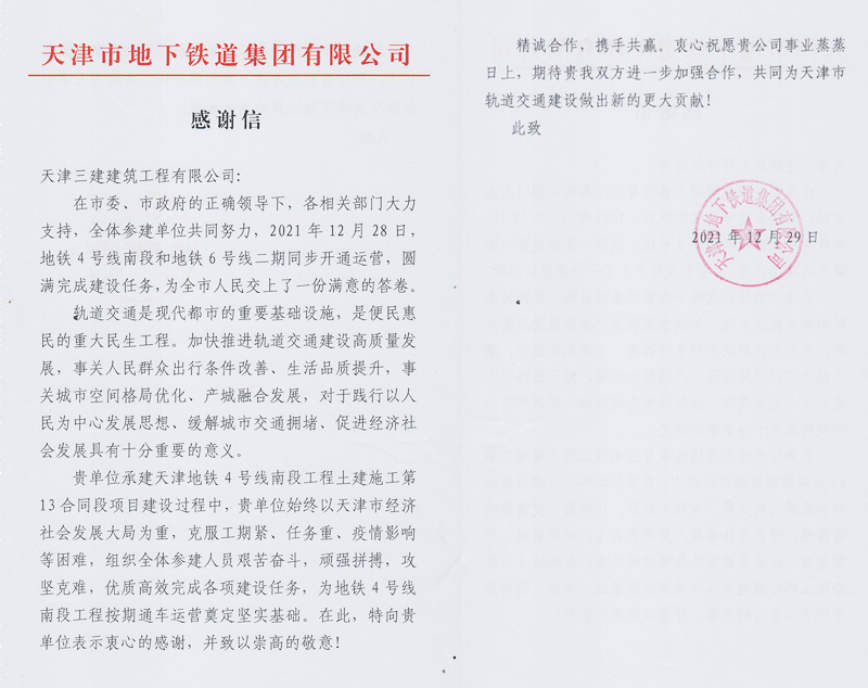 由天津三建建筑工程有限公司總承包施工天津地鐵四號(hào)線南段第13合同段工程地處市中心繁華地段,是該線網(wǎng)施工條件最為復(fù)雜、施工技術(shù)難度最大、危大工程項(xiàng)目最多的車站。我公司執(zhí)行最高標(biāo)準(zhǔn)的安全、質(zhì)量、綠色文明施工標(biāo)準(zhǔn),嚴(yán)格全過程、全覆蓋、無死角管理管控。項(xiàng)目全體參戰(zhàn)人員充分發(fā)揮“五加二、白加黑”的精神,克服周邊建筑物林立、地下管網(wǎng)分布密集、施工現(xiàn)場(chǎng)周圍車輛、人流稠密等諸多困難,科學(xué)組織、嚴(yán)細(xì)管理、緊密施工,2021年11月26日順利通過竣工驗(yàn)收和運(yùn)營(yíng)條件專家評(píng)審工作。取得了在高施工風(fēng)險(xiǎn)和復(fù)雜施工環(huán)境下“零事故、零傷亡”的安全預(yù)控目標(biāo);天津市安全綠色文明工地稱號(hào);通過了天津市結(jié)構(gòu)海河杯驗(yàn)收。在施工過程中,項(xiàng)目經(jīng)理部多次受到天津地鐵集團(tuán)表彰,并被授予“優(yōu)勝集體”榮譽(yù)稱號(hào)。