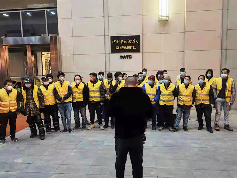 2021年1月15日18:00時,天津三建公司二分公司接到天津市河西區(qū)住建委改造津利華大酒店作為新冠疫情集中隔離點的緊急命令。二分公司黨總支緊急部署,迅速成立樾梅江項目黨支部和張家窩南站黨小組為主的戰(zhàn)斗小組,緊急動員黨員干部奔赴施工現(xiàn)場,調(diào)集勞動力和施工物資,黨支部書記劉鈁,以及王軍、張宇、邢勝,邢建公,李盛等黨員干部分別從各自的工作崗位、家中向津利華酒店集結(jié),邊開車邊組織勞動力和施工物資、車輛,僅僅一個小時,350人的應急勞務大軍和各種施工物資全部集結(jié)到位。