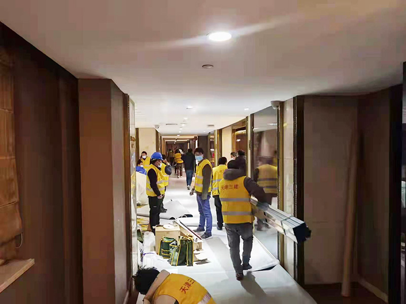 根據(jù)天津市疫情防控指揮部要求,將近兩萬平方米,200余間的客房改造任務必須在24小時內(nèi)完成并交付使用,時間緊、責任重,工作量大。全體參戰(zhàn)黨員干部身兼重任,牢記“疫情就是命令、防控就是責任”的要求,黨總支書記趙善伯、支部書記劉鈁親自上手,帶領黨員干部分層、分段負責,連續(xù)18個小時徹夜奮戰(zhàn),更換所有共同區(qū)域地膠、樓梯間、疫情通道隔墻板,設置各樓層消殺照明、應急照明等設施,提前兩個小時干凈整潔交付給市疫情防控指揮部,得到了市疫情指揮部、河西區(qū)住建委、酒店管理的高度肯定和贊揚。