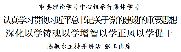 根據(jù)我市主題教育工作安排,市委常委同志認真學(xué)習領(lǐng)會習近平總書記關(guān)于黨的建設(shè)的重要思想,關(guān)于嚴肅黨內(nèi)政治生活的重要講話和重要指示批示精神,關(guān)于以學(xué)鑄魂、以學(xué)增智、以學(xué)正風、以學(xué)促干等重要論述,關(guān)于樹立和踐行正確政績觀的重要論述,學(xué)習習近平總書記對天津工作“三個著力”重要要求和一系列重要指示批示精神,學(xué)習黨章、新形勢下黨內(nèi)政治生活若干準則、縣以上黨和國家機關(guān)黨員領(lǐng)導(dǎo)干部民主生活會若干規(guī)定等黨內(nèi)法規(guī)。會上,市委常委同志結(jié)合思想和工作實際交流了學(xué)習體會。